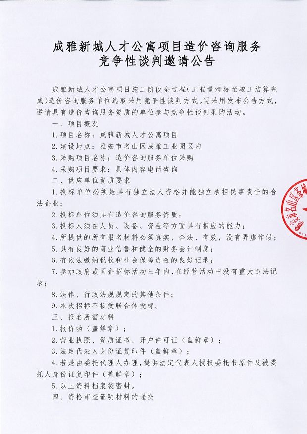 成雅新城人才公寓項(xiàng)目造價(jià)咨詢服務(wù)競爭性談判邀請(qǐng)公告